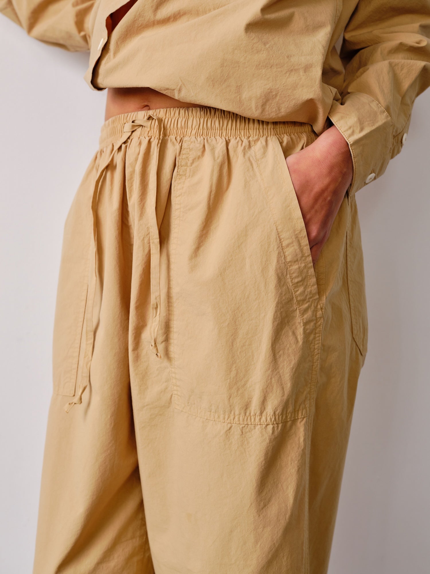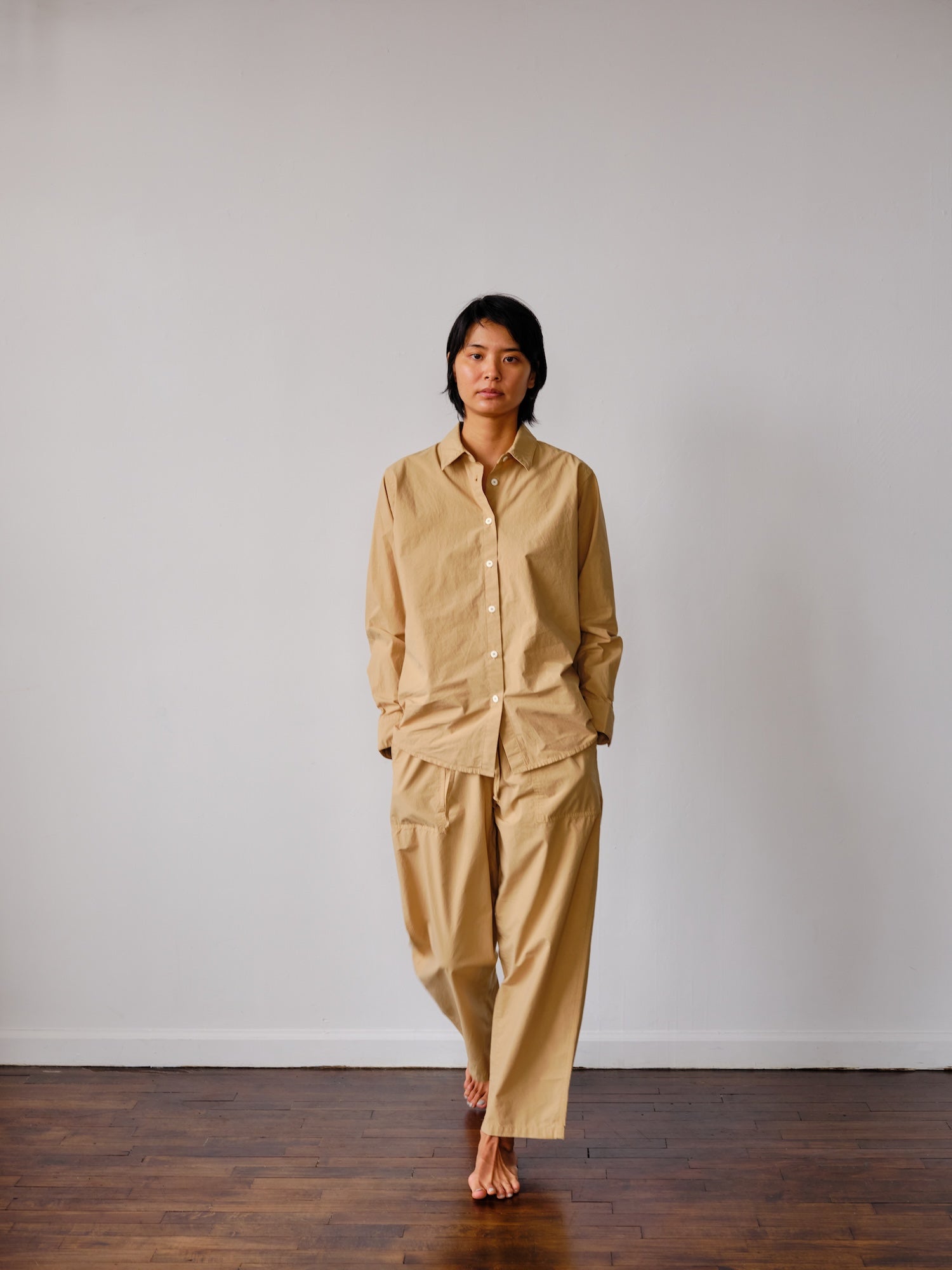 The Sucia Pant is made with Japanese fabric woven on a specialized high density loom, making for a crisp while also soft hand feel. The garment dye process makes for opulent colors and further softens the fabric.